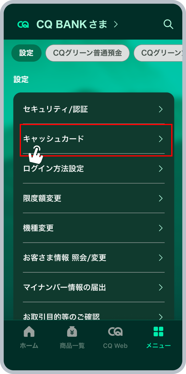 ホーム右下のメニューをクリックし、「キャッシュカード」をご選択ください。