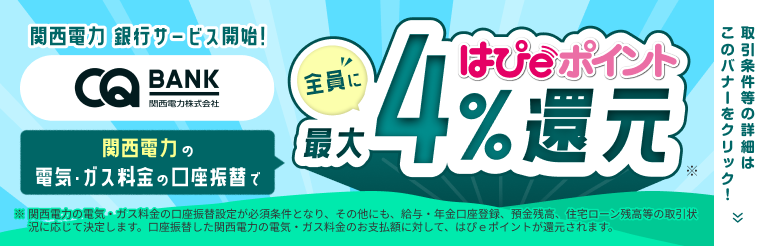 さらに住宅ローンをご契約いただいた方には、関西電力の電気・ガス料金をCQ BANKで口座振替していただくと、毎月のお支払い額に対して、口座振替による1%分の還元に加え、住宅ローン契約でさらに2%分、合計3%分の「はぴeポイント」を還元いたします。
