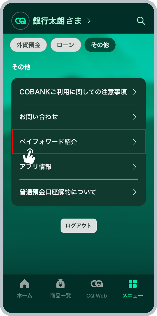 CQ BANKの口座をお持ちでないご家族やお友達が、CQ BANKの口座をお持ちの紹介者のペイフォワードIDを使用して、口座開設、かつ初回ログインすることで、紹介された方に1,500円をプレゼントいたします。