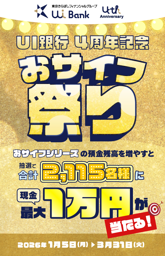 おサイフシリーズのキャンペーン期間中に、UI銀行のおサイフシリーズ「女神のサイフ」「はたらくサイフ」「まもりのサイフ」のいずれかの口座を保有していること。