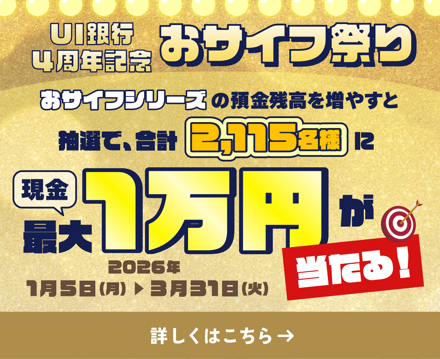 2025年10月1日(水)から2026年5月31日(日)までにUI銀行で新規口座を開設し、上記キャンペーン期間中に1年もの定期預金(Anniversary定期預金)へ新たにお預け入れいただいたお客さま